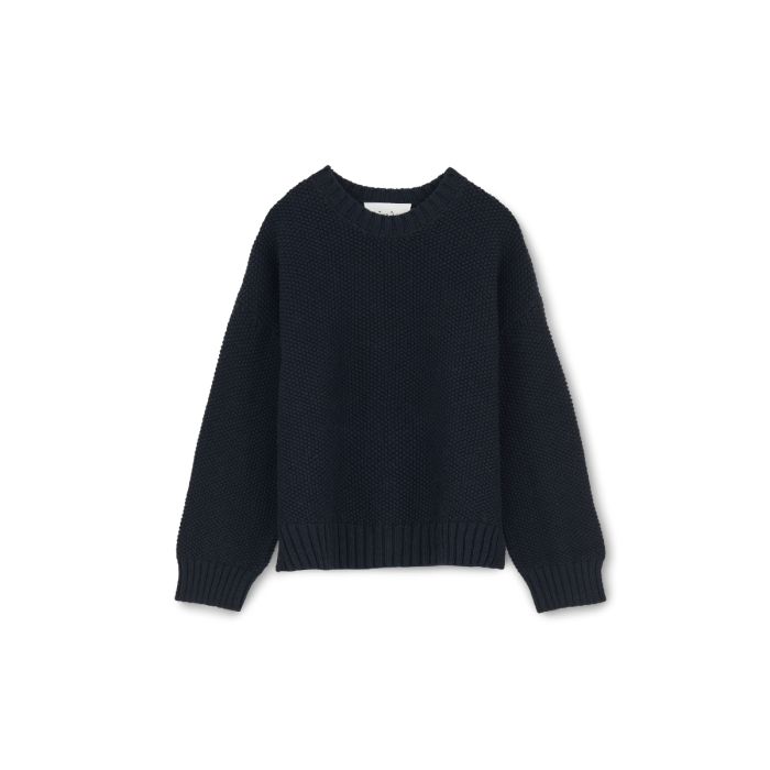 Ein eleganter Pullover aus weicher, dicker Hochland-Schafwolle. Der Pullover ist in einer boxy Passform mit einem schönen Perlmuster und Rippenbündchen gestaltet, was ihm ein raffiniertes Aussehen verleiht. Er ist mit einem Rundhalsausschnitt, überschnittenen Schultern und hohen Seitenschlitzen für einen stilvollen Touch versehen.