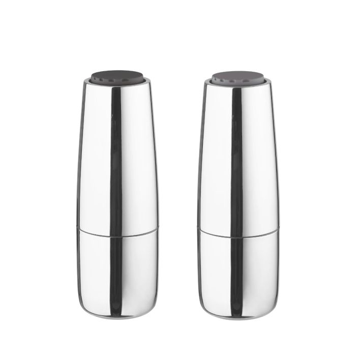 SALPI Salz- und Pfeffermühle, aus mattem Edelstahl gefertigt und verleiht eine Note von Stil! Die Einstellräder in zwei verschiedenen Beigetönen fügen einen subtilen Farbakzent am Esstisch hinzu. Die Behälter können über den einfachen Kupplungsmechanismus geöffnet und nachgefüllt werden. Die Korngröße ist von grob bis sehr fein einstellbar.