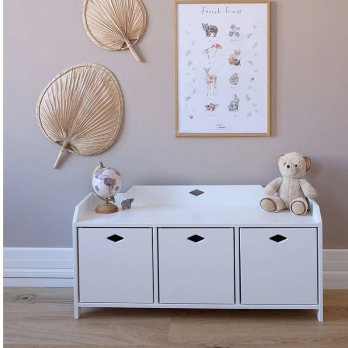 Die Aufbewahrungsboxen haben Filzstreifen am Boden, damit sie leicht bewegt werden können, ohne die Kisten oder den Boden zu beschädigen.
