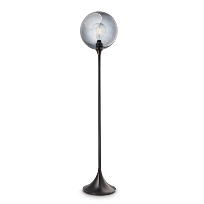 Der Fuß der Stehlampe ist schwarz, mit schwarzer Schnur und einem Schirm in der Farbe Smoke mit einem handbemalten Rand in Silber. Es wird empfohlen, eine 40-Watt-Edison-Glühbirne für die Lampe zu verwenden.