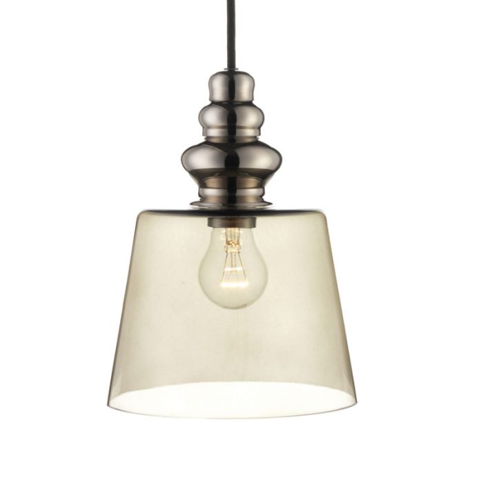 Mundgeblasene Glas-Pendelleuchten, die in klarem und rauchigem Glas mit schwarzer Stoffleitung erhältlich sind.