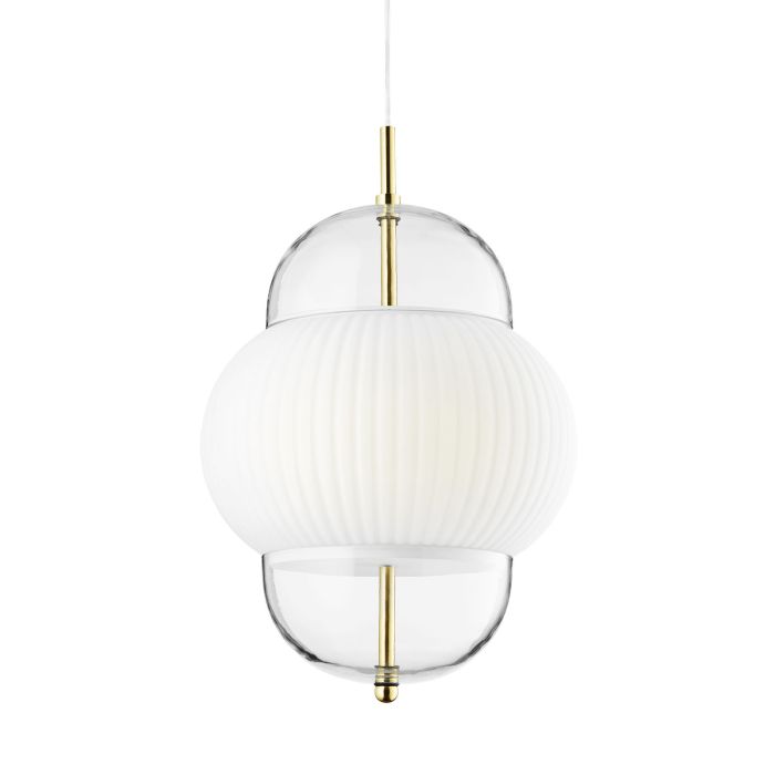 Schöner und klassischer Pendelleuchter, der Messing und Glas vereint. Die Lampe hat eine feminine Leichtigkeit, von der das Licht aus dem Kern der Lampe strahlt und ein weiches und diffuses Licht wirft.