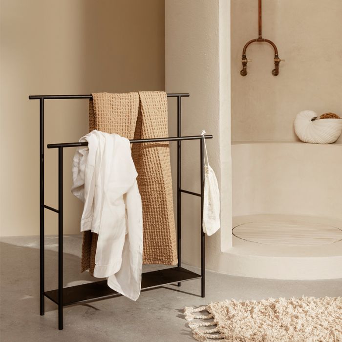 Freistehendes Möbelstück perfekt für das Badezimmer. Der Handtuchständer Dora Towel Stand ermöglicht es Ihnen, mehrere Handtücher gleichzeitig aufzuhängen und bietet Ihnen gleichzeitig zusätzlichen Stauraum unten.