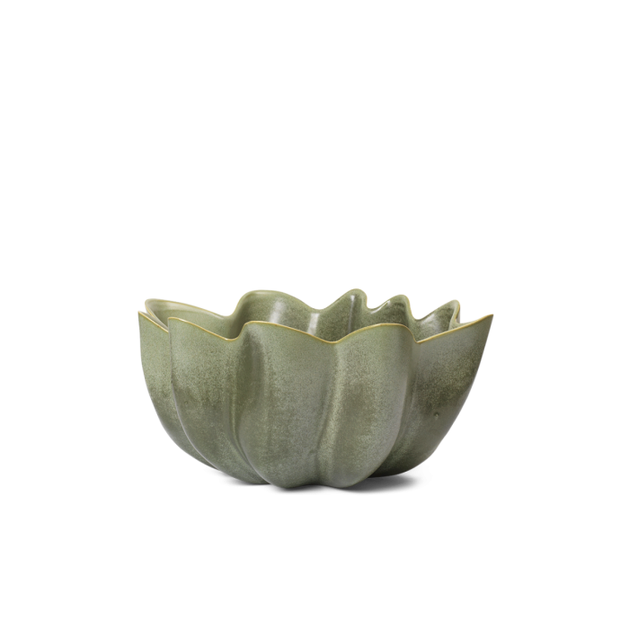 Elegante und dekorative Schale von Ferm Living. Die Form der Schale ist von den anmutigen Falten in Textilien inspiriert, die fließende und schöne Faltungen erzeugen. Die dynamischen Kurven der Schale werden durch die reaktive Glasur betont, die mit Licht und Schatten spielt. Verwenden Sie die Schale als dekoratives Objekt oder als Obst-/Servierschale.