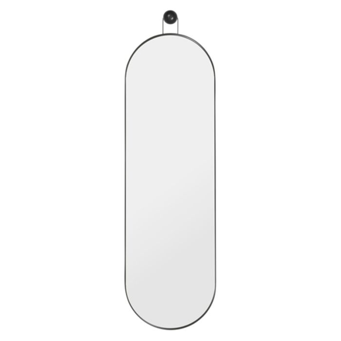 Ferm Living Spiegel. Das Design des ovalen Spiegels hat elegante Linien und einen schwarzen pulverbeschichteten Metallrahmen. Der mitgelieferte schwarze Holzhaken ergänzt die strenge Silhouette mit einem natürlichen Finish.