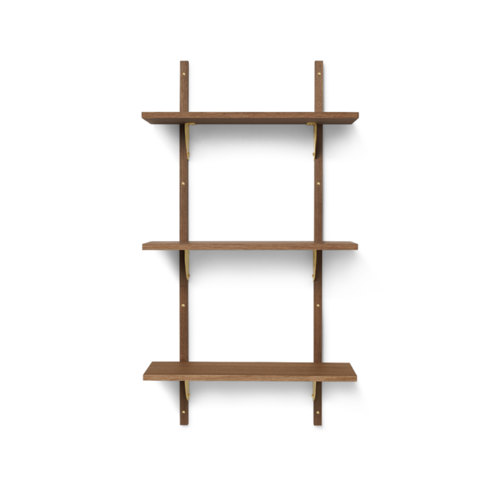 Das Sector-Regal ist eine Neuinterpretation der Regale der 50er und 60er Jahre und zeichnet sich durch seine robuste Einfachheit und die klassische Kombination aus Holz und Messing aus - es ist mit naturbelassenem Eichenfurnier erhältlich, das dunkel gebeizt und lackiert ist, sowie mit polierten oder geschwärzten Messingbeschlägen.