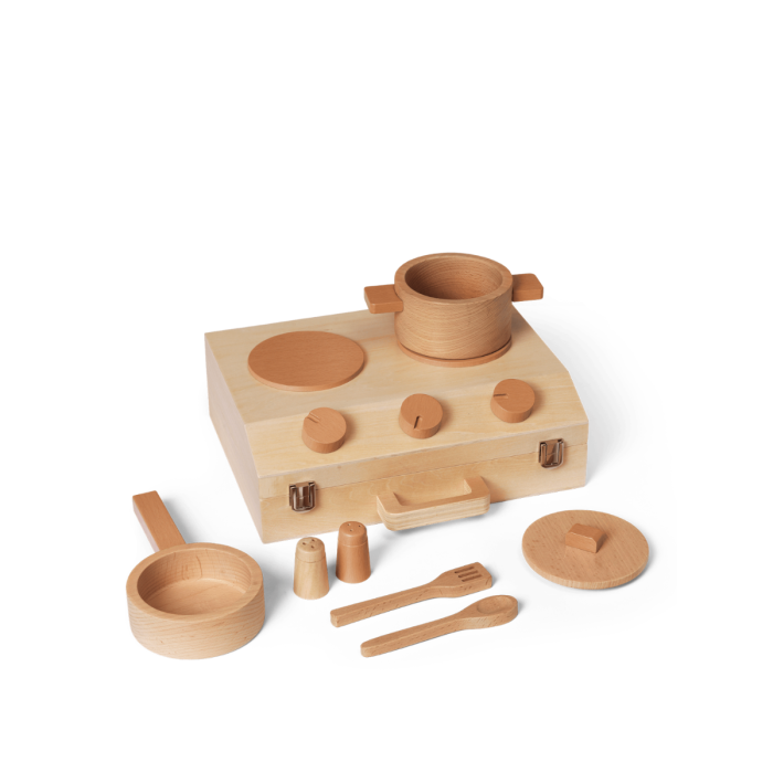 Die Toro Koffer-Küche ist aus FSC®-zertifiziertem Holz gefertigt und stellt eine charmante Mini-Küche dar, die clever in einem praktischen Koffer untergebracht ist. Dieses umfangreiche Spielzeug enthält einen Topf, eine Pfanne und verschiedene Werkzeuge, die den Kindern alles bieten, was sie brauchen, um fantasievolle Mahlzeiten zuzubereiten und lustiges Spielen zu ermöglichen. Das kompakte und tragbare Design macht den Koffer äußerst flexibel, sodass er leicht auf Reisen mitgenommen oder dem Kinderzimmer Charme verleihen kann.