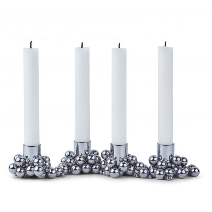 Der Leuchter besteht aus Kerzenhaltern, Magneten und vielen kleinen Stahlkugeln.