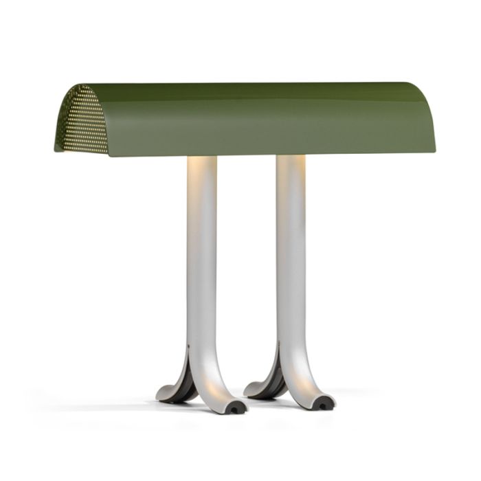 Die Anagram Lampe hat eine robuste Konstruktion und ein starkes Aussehen, einen gebogenen, glänzenden Schirm, der auf zwei geteilten Beinen aus eloxiertem Aluminium sitzt.