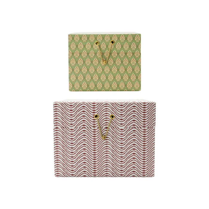 Verleihen Sie Ihrem Homeoffice mit diesen schön gestalteten Aufbewahrungsboxen in Rot und Khaki eine elegante Note. Hergestellt aus strapazierfähigem Papier, haben sie zwei einzigartige Muster in verschiedenen Größen, die sowohl stilvoll als auch praktisch sind. Jede Box ist mit einem charmanten Goldknopf und einem schwarzen Gummiband zur einfachen Verschließung verziert, während das Innere eine solide komplementäre Farbe hat. Diese Boxen eignen sich perfekt zur Organisation Ihres Büros oder Wohnzimmers und fügen gleichzeitig ein dekoratives Element hinzu, das Funktionalität und Ästhetik kombiniert.