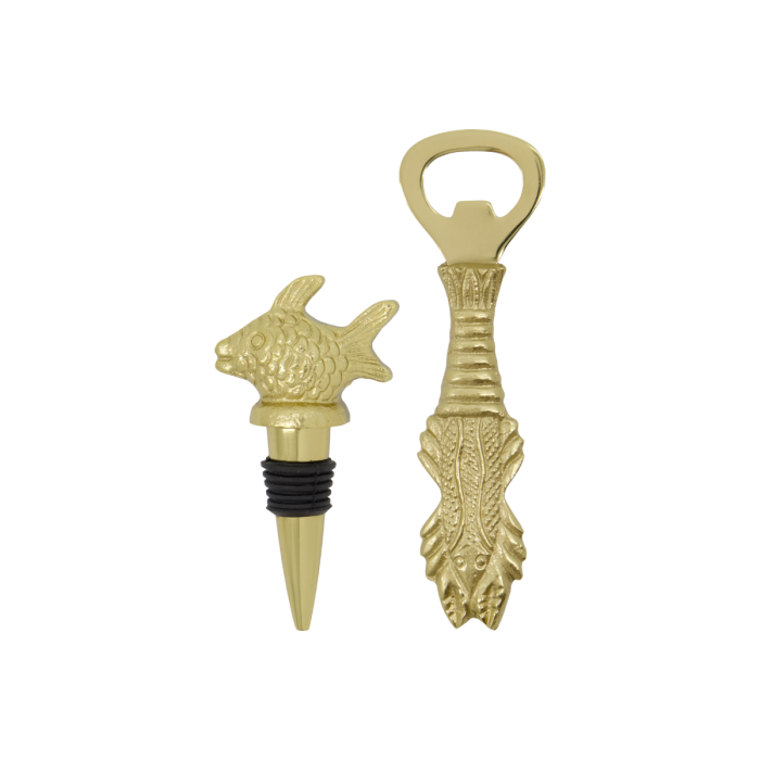 Fügen Sie mit diesem charmanten Set an Barzubehör eine persönliche Note in Ihre Küche hinzu. Der Flaschenverschluss ist mit einem eleganten Design verziert, während der Öffner mit einem einzigartigen Hummergriff in einem schönen antiken Goldton ausgestattet ist. Diese Werkzeuge vereinen Funktionalität mit künstlerischem Flair und sind sowohl praktisch als auch stilvoll. Sie sind eine unverzichtbare Ergänzung zu Ihrer Bar oder ein durchdachtes Geschenk für den Gastgeber oder die Gastgeberin. Bringen Sie Freude und Eleganz zu Ihren Veranstaltungen mit diesen auffälligen Stücken.