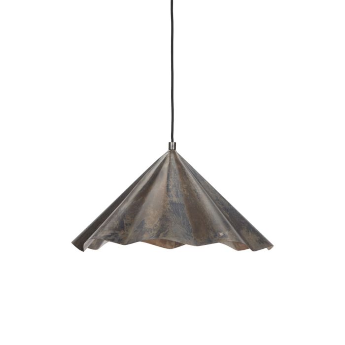 Der gewellte, fließende Lampenschirm balanciert die industrielle Oberfläche des Pendels aus und erzeugt ein gemütliches Licht.