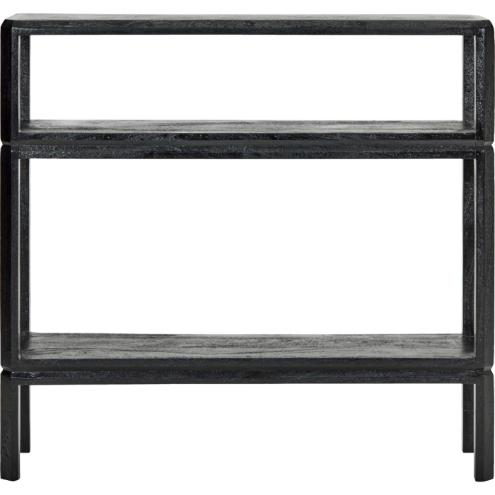 Dieser Konsolentisch aus schwarz gebürstetem Mangoholz strahlt einen bohemien-inspirierten Lebensstil mit seinem einzigartigen Design und glatten Finish aus. Er eignet sich ideal für schmale Räume und ergänzt die Wandregale der gleichen Serie wunderschön. Zusammen verleihen sie jedem Raum eine elegante Note.