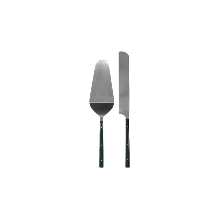 Das HDLata-Set besteht aus einem Kuchenspatel und einem Kuchenmesser aus gebürstetem, rostfreiem Stahl mit Griffen aus Polyresin in einem tiefen Grünton und hat ein klassisches und elegantes Design mit zwei Teilen.