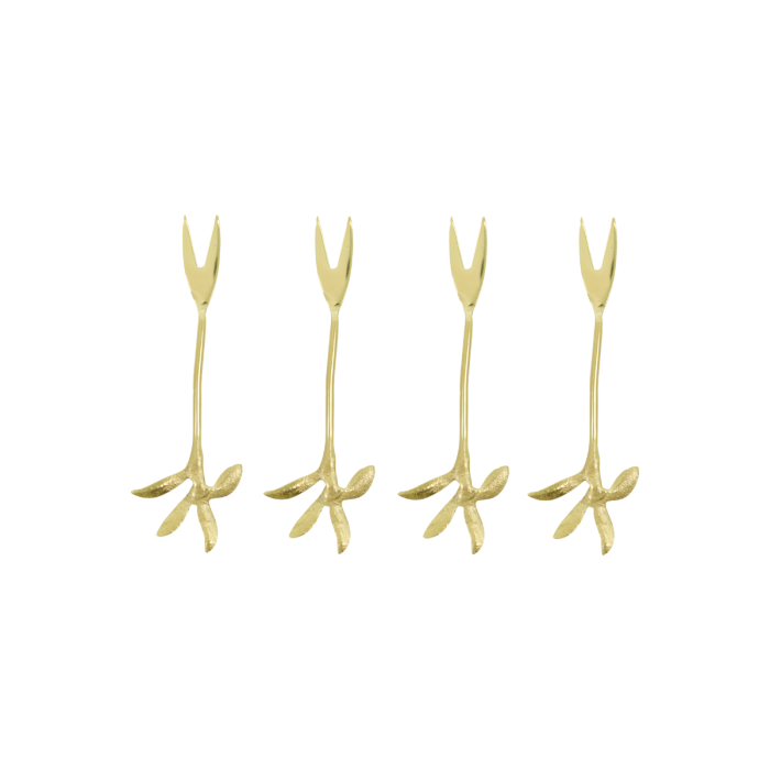 Fügen Sie mit diesem eleganten Set Serviergabeln eine raffinierte Note zu Ihrem Esszimmer hinzu. Hergestellt aus Edelstahl und mit einem schönen antiken Goldfinish versehen, haben die Gabeln eine organische Form und sind oben mit zarten Blattmotiven verziert. Dieses Set aus vier Gabeln vereint Funktionalität mit visuell ansprechendem Design und macht sie zu einer perfekten Wahl für jeden Anlass und zu einem schönen ergänzenden Detail für Ihre Tischdekoration. Set mit 4 Stück.