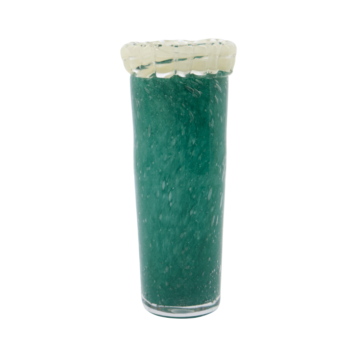Diese einzigartige Glasvase ist handgefertigt mit makelloser Handwerkskunst und verleiht Ihrem Zuhause eine lebendige Note. Ihre einzigartige Blasenglasstruktur und der weiche, geschwungene Rand schaffen einen künstlerischen Kontrast, der die Aufmerksamkeit erregt und Charme verleiht. Verwenden Sie sie, um Blumen auszustellen oder als Teelichthalter, um ein warmes, einladendes Leuchten in Ihrem Zuhause zu schaffen.