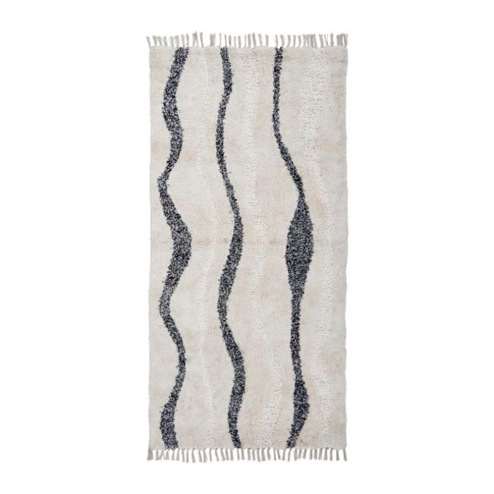 Verwöhnen Sie Ihr Wohnzimmer mit diesem handgewebten beigen Teppich aus der Kategorie Home Textiles. Es präsentiert ein einzigartiges, wellenförmiges Muster in Off-White und Grautönen, elegant ergänzt durch feine Fransen. Geeignet zur Dekoration von Böden und Wänden, fügt dieser Teppich jedem Raum eine Welle von Eleganz hinzu.