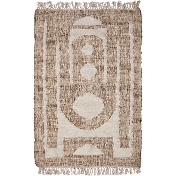Dieser Teppich ist handgefertigt bis zur Perfektion und verleiht Ihrem Zuhause Wärme und Stil. Er besteht aus einer Mischung aus Wolle, Jute und Baumwolle und hat eine natürliche Nuance mit einem modernen Off-White-Grafikmuster. Das komplexe Design und die Fransenkanten machen es zu einem vielseitigen Produkt, egal ob es auf dem Boden liegt oder als Wandkunst präsentiert wird. Sein ästhetischer Reiz und sein gemütlicher Charme machen ihn zu einer idealen Ergänzung für Ihren Eingangsbereich oder Ihr Wohnzimmer.