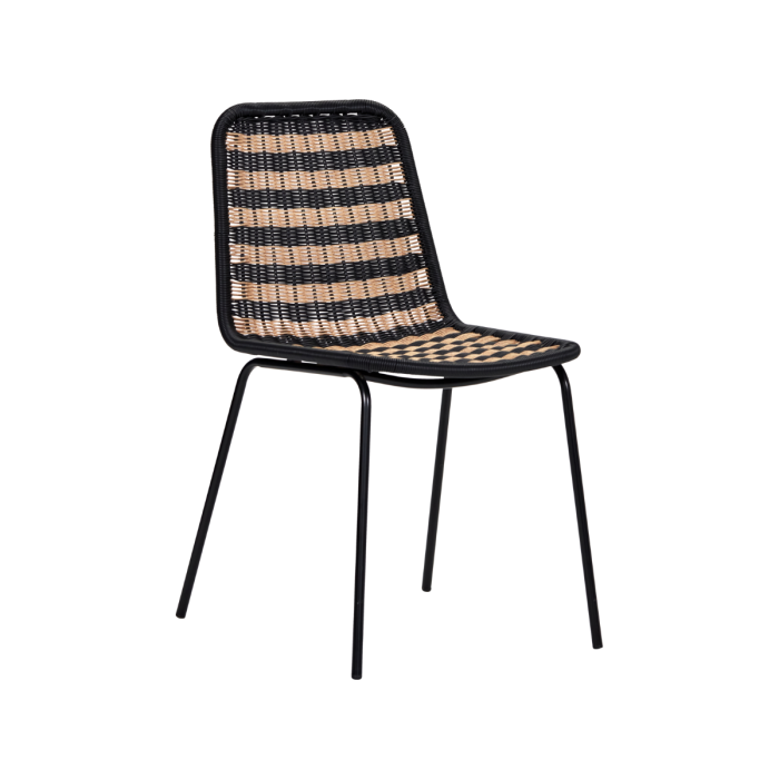 Fügen Sie Stil und Charme in Ihr Esszimmer mit diesem auffälligen Stuhl ein, der sowohl für den Innen- als auch für den Außenbereich perfekt geeignet ist. Das natürliche und schwarz gestreifte Muster verleiht dem Stuhl einen modernen und raffinierten Look, der in jedes Dekor passt. Sitzfläche und Rückenlehne sind aus Polyethylen gefertigt, was sowohl Langlebigkeit als auch eine elegante optische Anziehungskraft gewährleistet. Die schlanken schwarzen Eisenbeine unterstützen den Stuhl stabil und ergänzen das kantige Design mit einer schwarz umwickelten Kante, die eine zusätzliche Note verleiht.