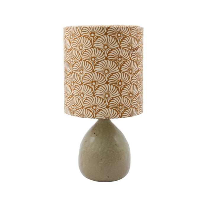 Fügen Sie mit dieser bezaubernden Tischlampe Wärme in Ihr Zuhause ein. Sie verfügt über einen sandfarbenen keramischen Fuß und einen Leinenschirm, der mit handbedruckten Sand- und Braunfächer-Motiven verziert ist, die eine moderne und gemütliche Ästhetik wunderschön ausbalancieren. Perfekt, um Ihrem Nachttisch, Beistelltisch oder Ihrer Konsole eine Portion Komfort hinzuzufügen.