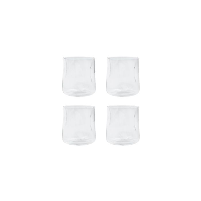 Dieses Set enthält vier elegante Gläser mit einer organischen Form, die angenehm in der Hand liegen. Die Gläser sind aus mundgeblasenem, gepresstem Glas gefertigt, was ihnen Charakter und Qualität verleiht.