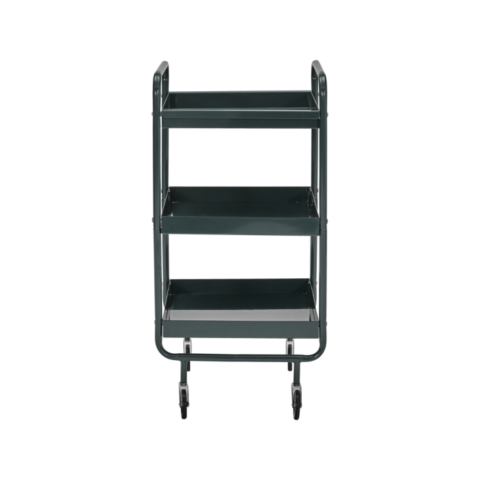 Verleihen Sie Ihrem Zuhause mit diesem eleganten Servierwagen in einem tiefen dunkelgrünen Farbton sowohl Stil als auch Funktionalität, der gleichzeitig Ordnung und Ästhetik schafft. Hergestellt aus robustem Stahl bietet der Wagen sowohl Stärke als auch ein praktisches Design mit einem abnehmbaren Tablett, das es Ihnen ermöglicht, Ihre Sachen leicht zu servieren oder zu organisieren. Die vier glatten Räder sorgen dafür, dass der Wagen mühelos zwischen Küche, Homeoffice oder Wohnzimmer bewegt werden kann, während er jedem Raum eine raffinierte Note verleiht. Die schlanke Silhouette und die satte Farbe machen diesen Servierwagen zu einer unverzichtbaren und stilvollen Ergänzung Ihrer Einrichtung.