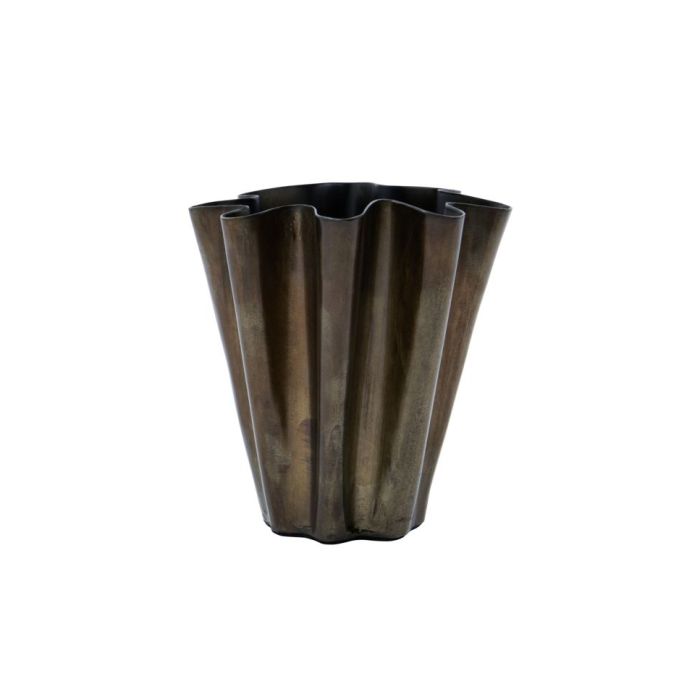 Flood ist aus Eisen gefertigt, was dem Ganzen ein sehr industrielles und rustikales Aussehen mit der metallischen Farbe verleiht. Die einzigartige Farbe und die Falten auf jeder Seite der Vase verleihen ihr einen dynamischen, herausfordernden und interessanten Ausdruck. Die kleinen Falten in der Vase sorgen außerdem dafür, dass die Blumen an Ort und Stelle bleiben und nicht herausfallen.