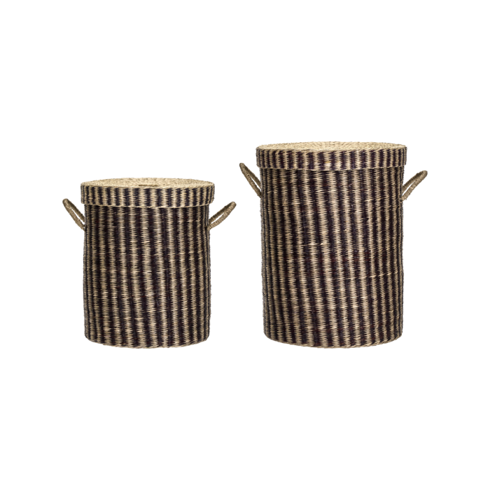 Diese handgewebten Körbe aus Seegras kombinieren praktische Aufbewahrung mit einer dekorativen Ästhetik. Das natürliche und braun gestreifte Design verleiht einen rustikalen Touch, der perfekt in jeden Raum passt. Verwenden Sie sie zum Wäschewaschen oder zur Aufbewahrung von Decken und anderen Notwendigkeiten. Der eingebaute Metallrahmen sorgt für Stabilität, und die Deckel halten den Inhalt verborgen und organisiert. Das Set, das zwei Größen umfasst, bietet Flexibilität für verschiedene Aufbewahrungsbedürfnisse und fügt Ihrer Wohnkultur einen charmanten Touch hinzu.