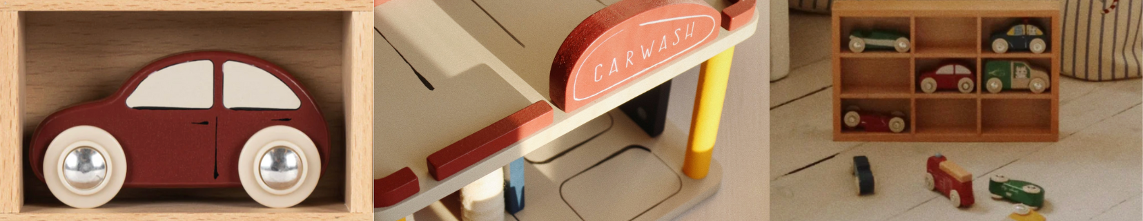 En anden idé er at kombinere den klassiske bilgarage i træ med Konges Sløjd Bil Vask - Multi, så børnene kan lege med biler både indendørs og udendørs.
