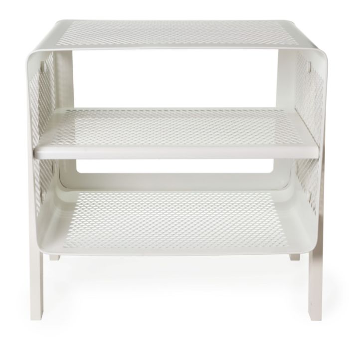 Das Schuhregal ist aus perforiertem Metall mit einem feinen Lochmuster gefertigt. Das Schuhregal von Tica ist praktisch und perfekt für den Eingangsbereich, kann aber auch im Schlafzimmer oder Kleiderschrank als kleiner Tisch verwendet werden. Das Schuhregal hat ein schlichtes Design, das ideal zur Aufbewahrung von Dingen und Sachen ist.